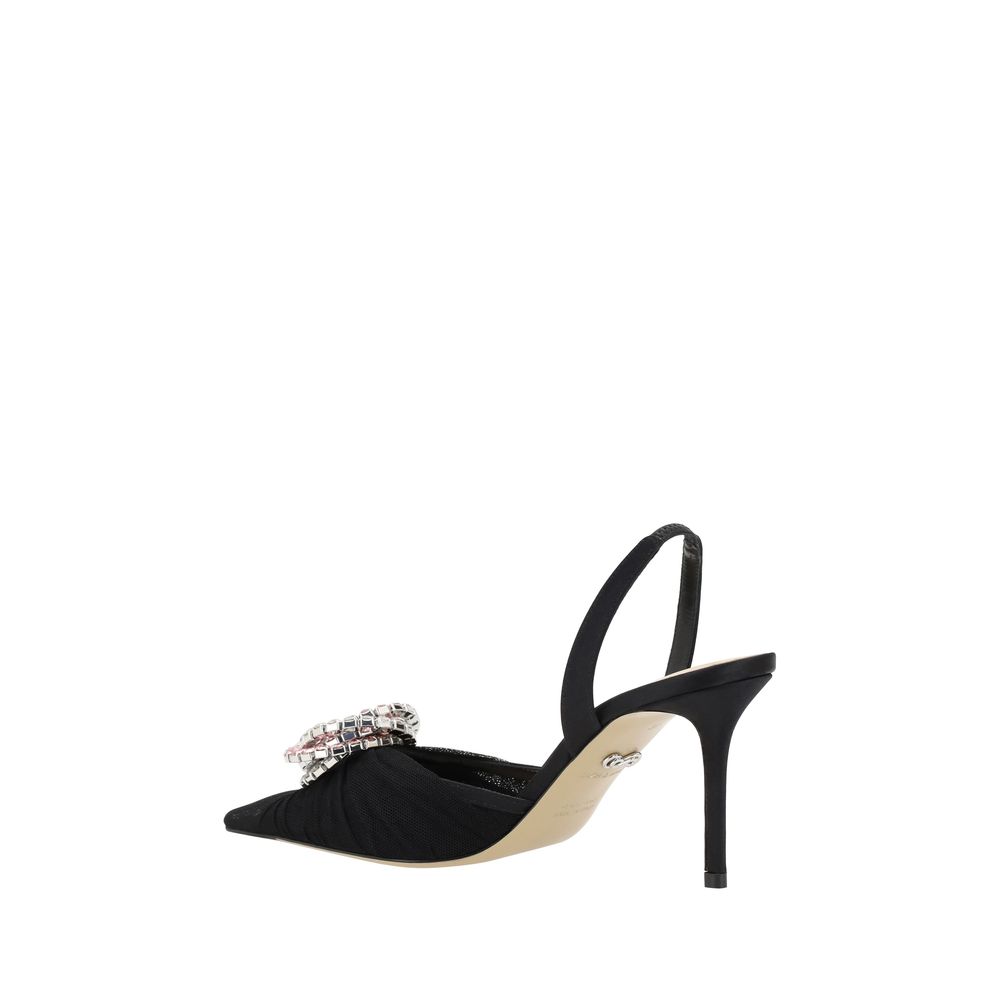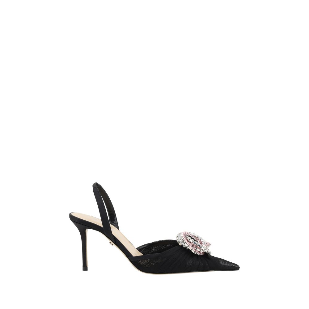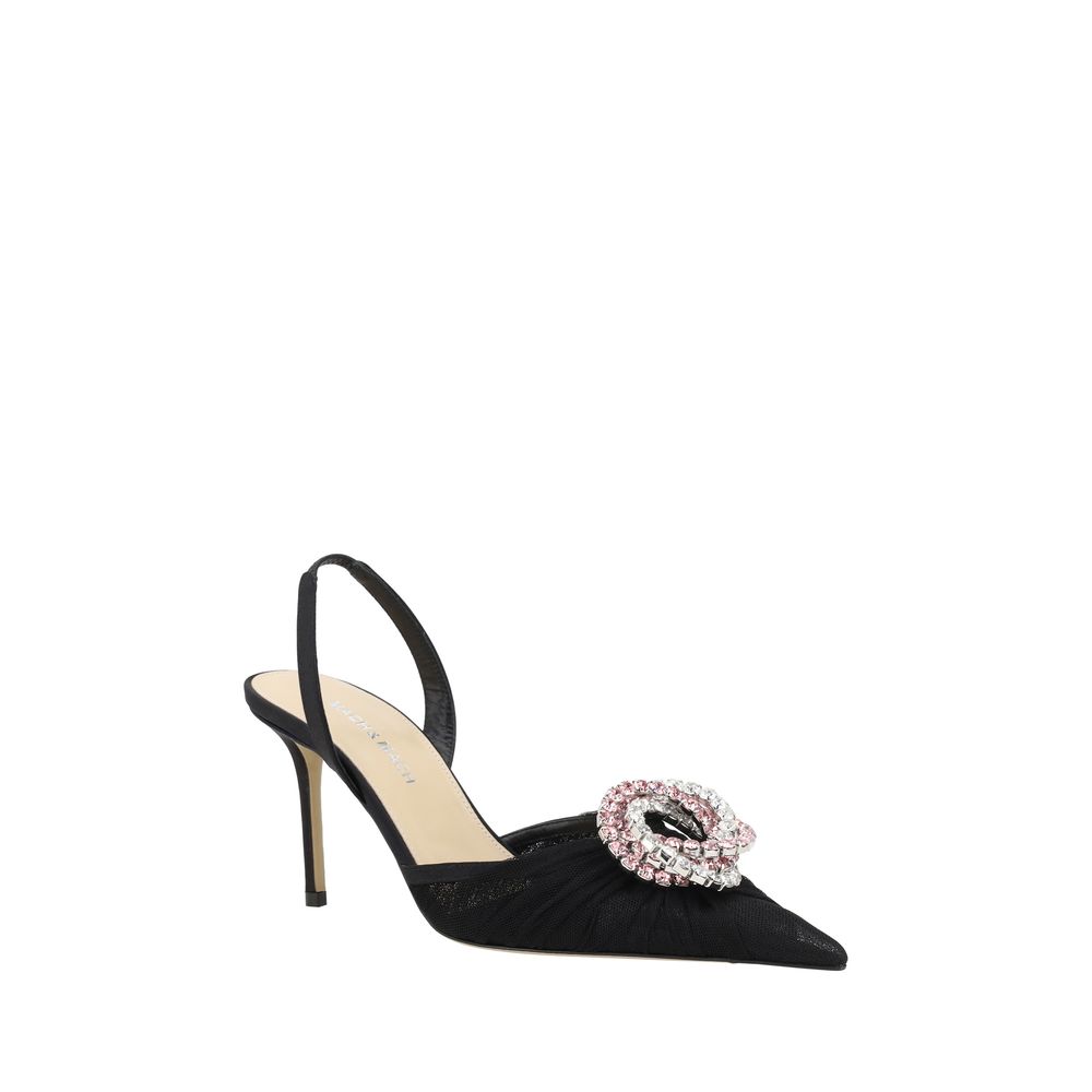 Mach & Mach’s Galaxy pumps are the epitome of elegance and glamour. Made of semi-transparent tulle, they feature a sophisticated design with an almond toe that enhances the shoe’s femininity. The stiletto heel slims the figure, while the applied rhinestone detail on the front catches the light, adding a touch of sparkle and sophistication. The elasticized slingback ensures a comfortable and secure fit, completing the look with a touch of modernity and luxury.
