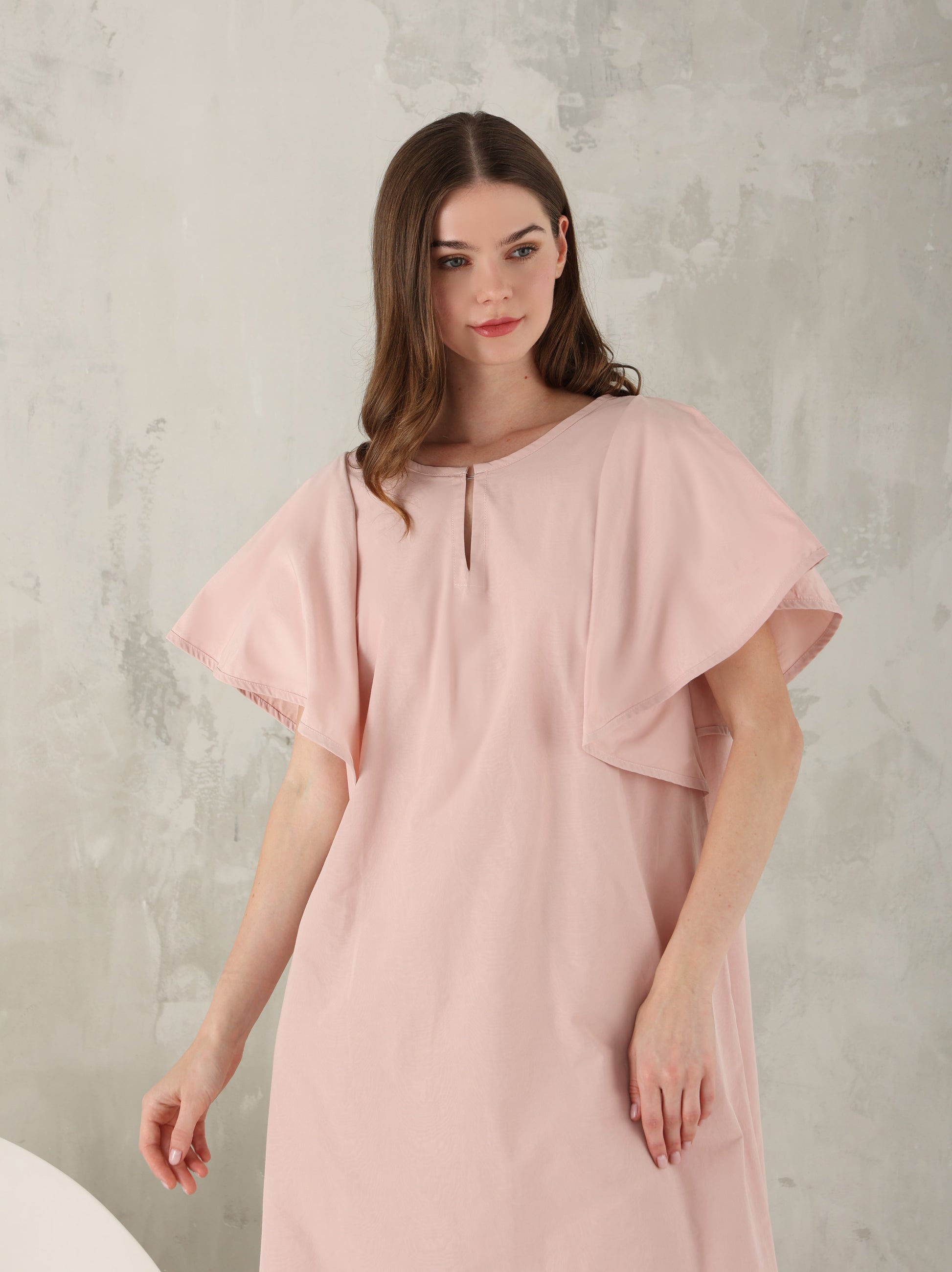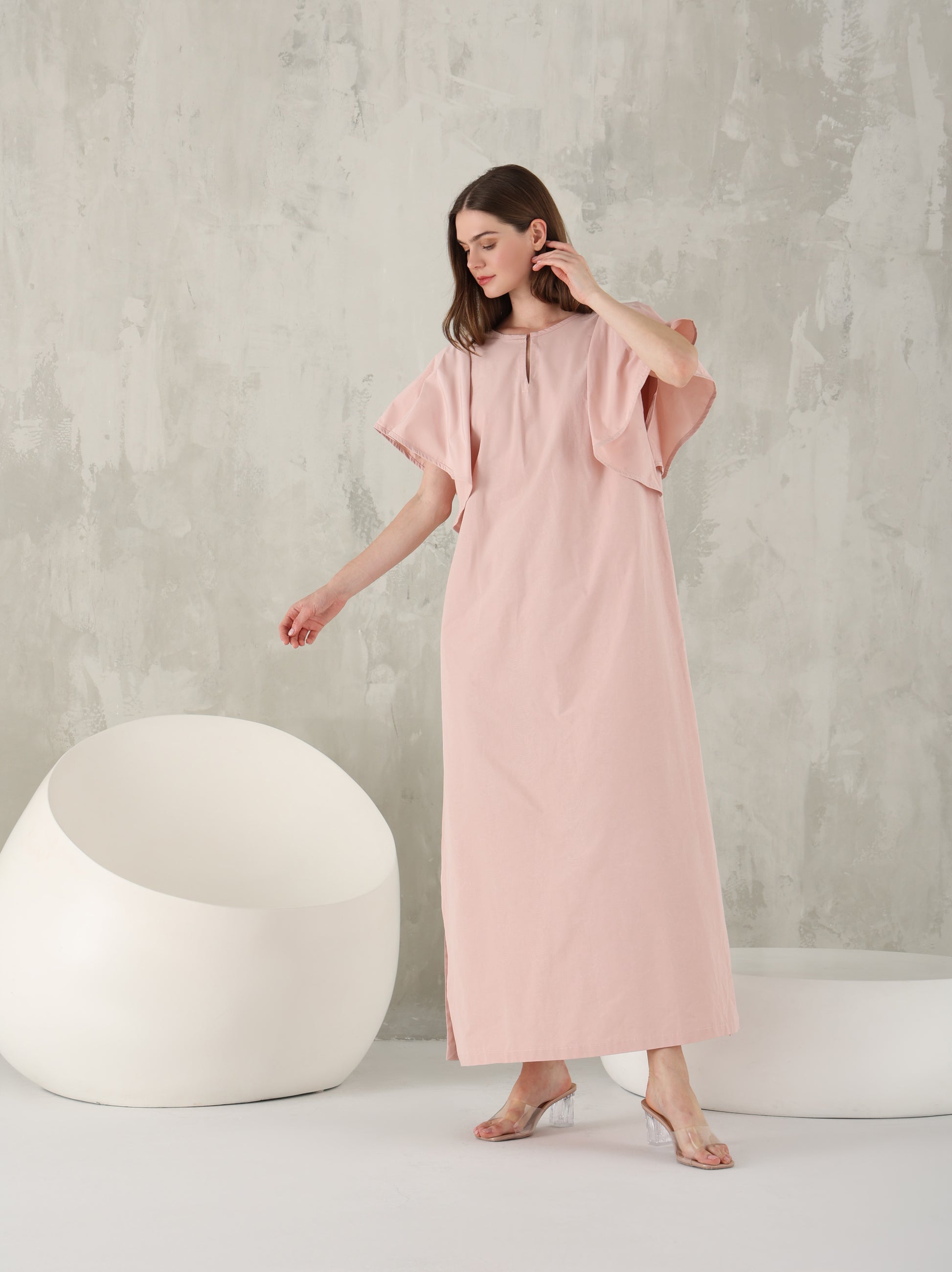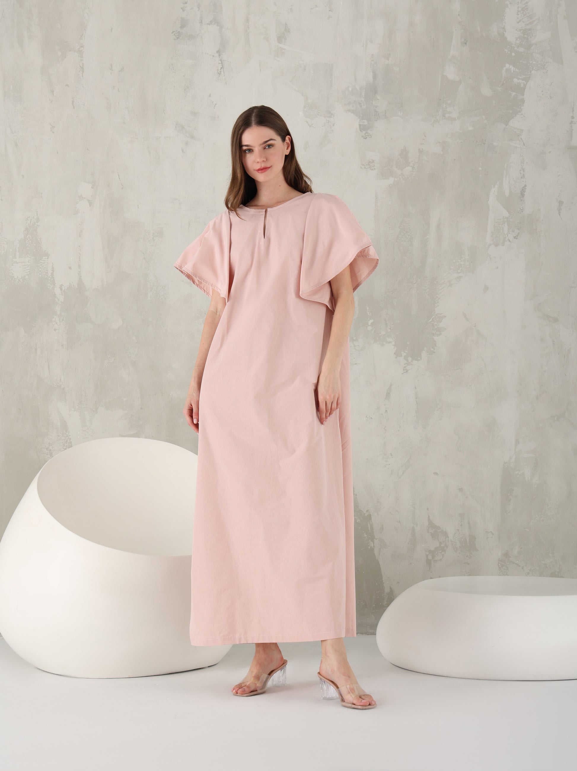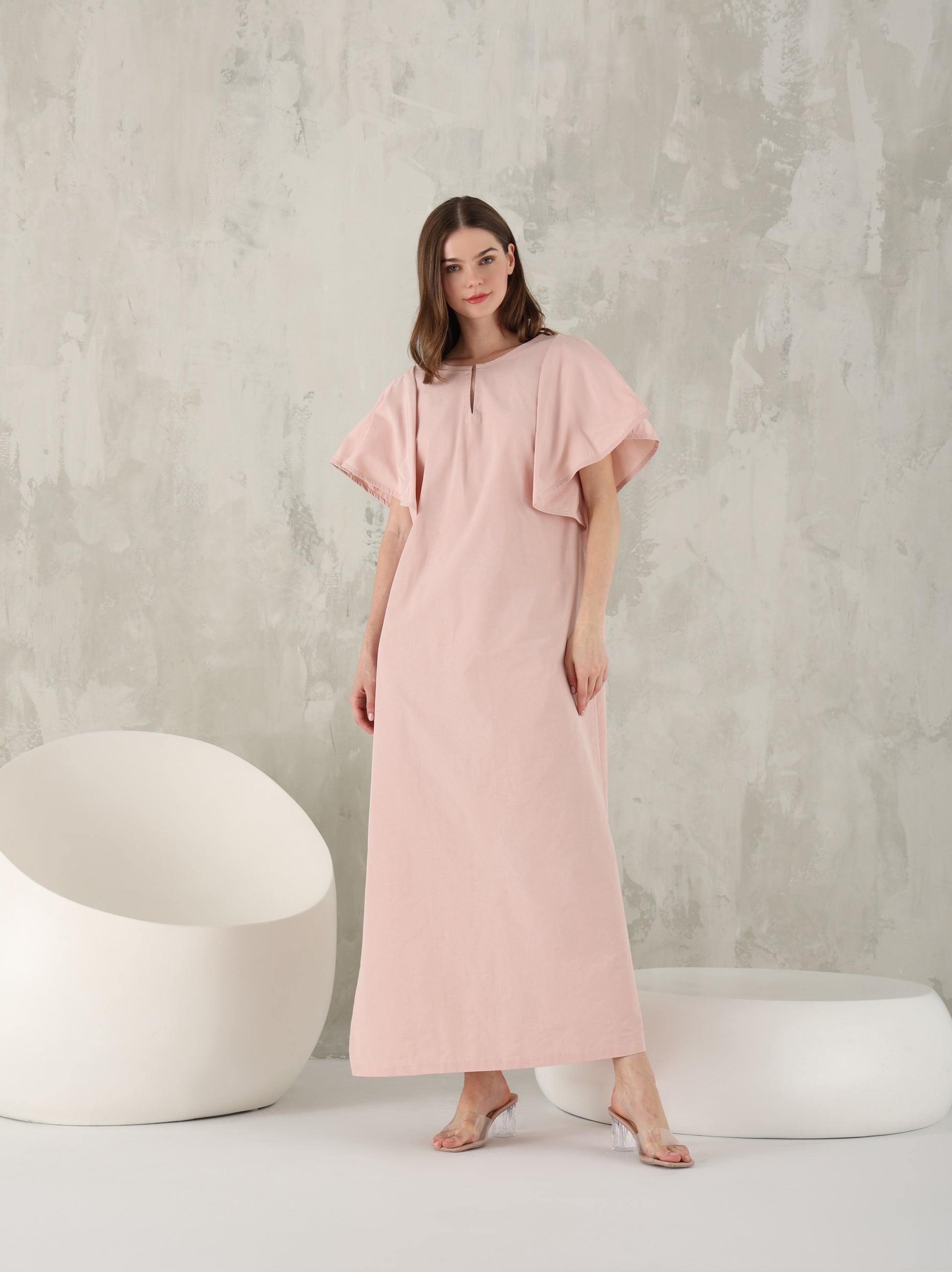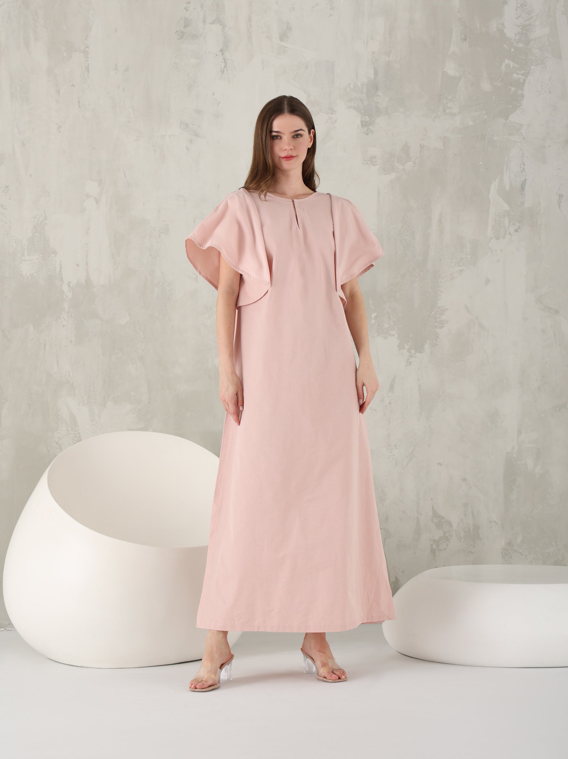 القفطان باللون الوردي الفاتح مع الكشاكش الضخمة هو أسلوب مرن بشكل خيالي مع فتحة عنق أمامية.
