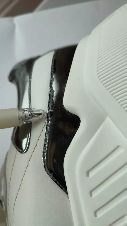 This item has a minor defect, there is some minor fade in the silver color and blue penmark on the tip of one of the shoes (see pictures).