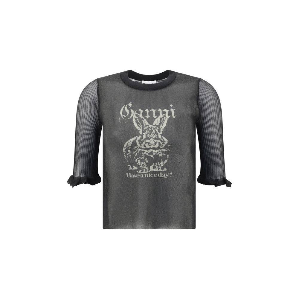 Ganni’s jacquard top is a sophisticated and original piece featuring a ribbed crew neck that adds a touch of sophistication. The ruffled 3/4 sleeves and ribbed back panel give the design a feeling of movement and delicacy. The semi-transparent texture, enhanced with lurex, gives the top a bright and modern effect. The iconic logo and Bunny on the front complete the look with a distinctive and playful touch, making this top perfect for those seeking elegance with a hint of originality.