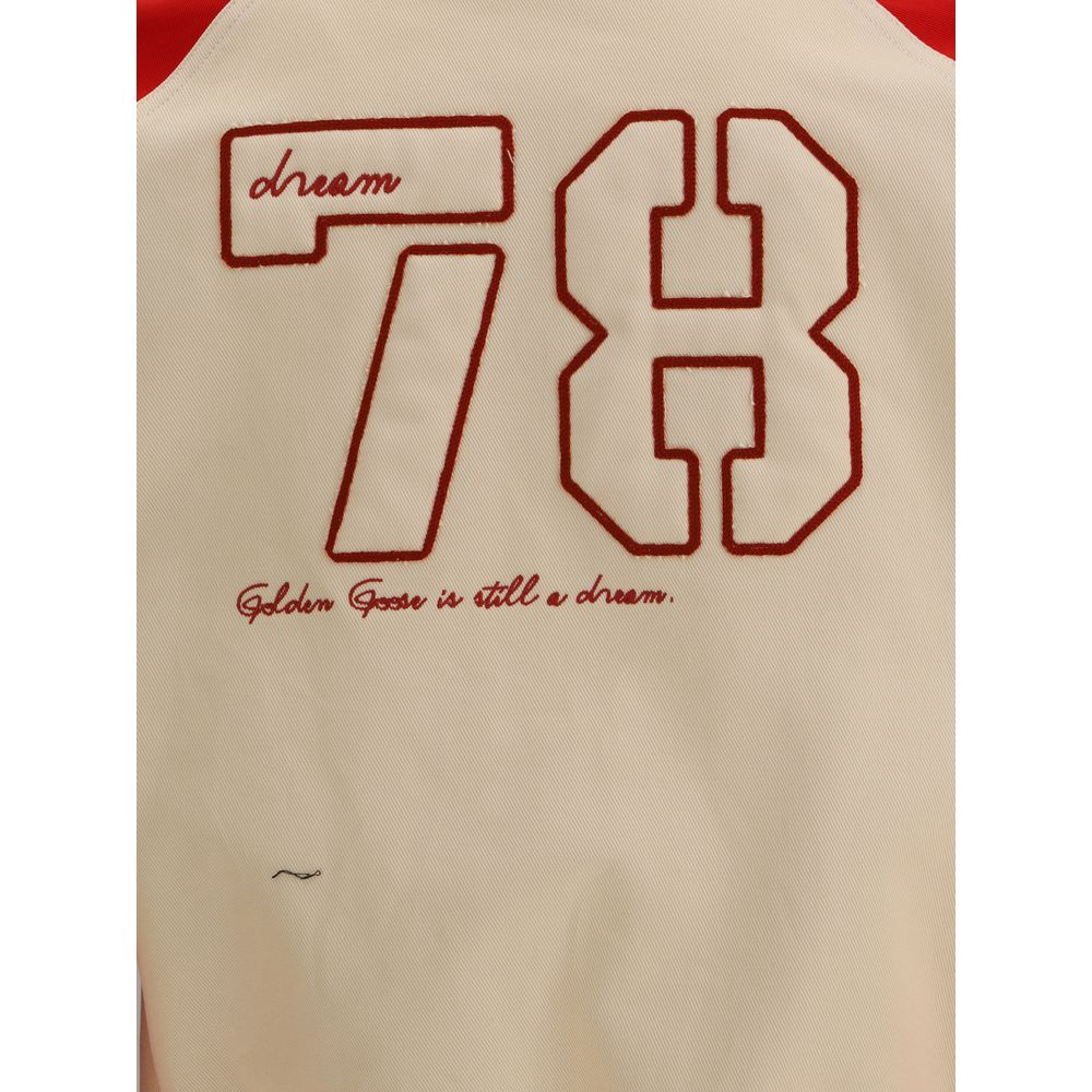 Golden Goose’s Embroidered bomber Jacket is a sporty and stylish piece that combines comfort with distinctive details. With a ribbed plush collar, hem and cuffs, it provides a comfortable and casual fit. The front snap button closure and two side welt pockets add functionality to the design. The iconic embroidered logo on the front and back lends an exclusive and recognizable touch, making this jacket perfect for an urban, edgy look.
