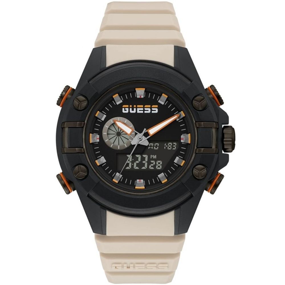 Type of mechanism: QUARTZ.Display: ANALOG/DIGITAL.Material Of Case: RESIN.Colour Of Case: BLACK.Material Of Bracelet: RESIN.Colour Of Bracelet: BEIGE.Dial Colour:BLACK.Glass type: MINERAL.Clousure: BUCKLE.Water resistence: 5ATM.Diameter dial: 47MM.Special Functions:G FORCE-ALARM-STOPWATCH