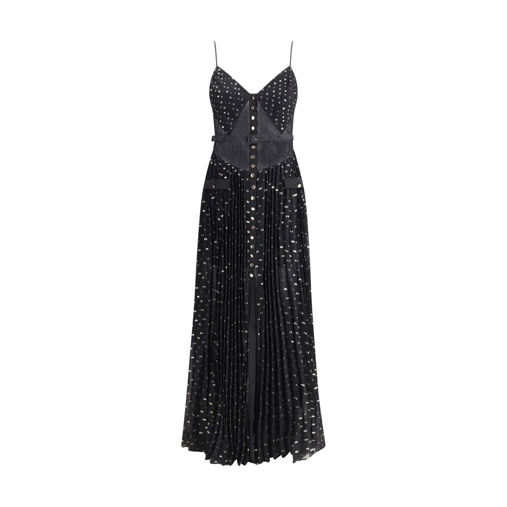 Chemisier long Dress by Self-Portrait has a sophisticated and feminine design. Featuring front button closure and sweetheart neckline on the front, while the deep back neckline adds a sensual touch. The garment is embellished with semi-transparent lace details applied on the front, adding sophistication and lightness. The adjustable and removable waistband allows you to customize the fit and define the silhouette. Perfect for elegant occasions and special evenings.